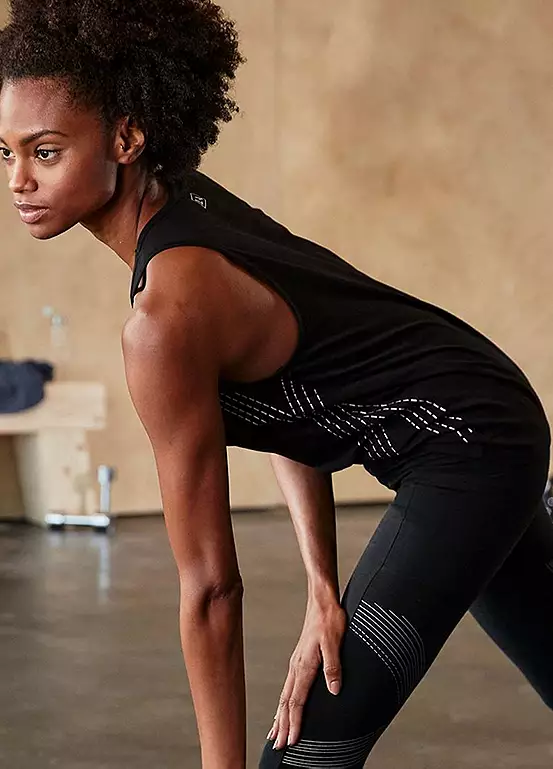 Tank top by Lascana Active. With reflective print on the front. Cut a little longer. With a round neckline. Good to combine. Fine, soft cotton quality. Round neck. Logo lettering. Perfect for fitness, gymnastics, running. 95% Cotton, 5% Elastane.