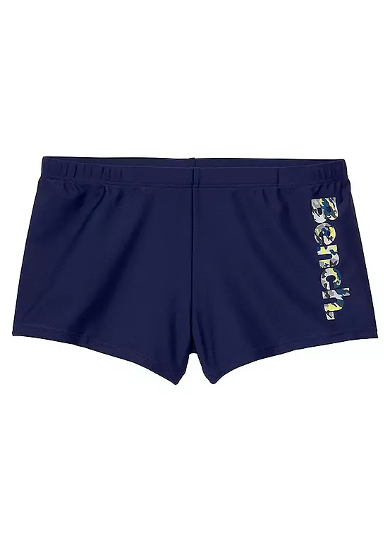 Stylish swimming trunks with hidden drawstring and the logo written at the side in a camouflage look. Cool camouflage logo print.