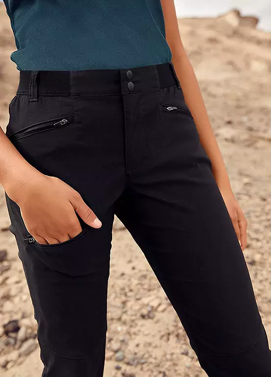 Sporty, stretchy hiking trousers with a comfortable elasticated waistband with button closure and four zipped pockets for plenty of storage space. The hem width can be extended with a zip and the look is complete with a drawstring at the hem and breathable stretch fabric.