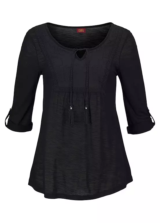 Enhance your holiday wardrobe! This stylish beach cover-up is great for a uncomplicated and cool look. Features a rounded neckline with tie straps and small tassels, along with tone on tone embroidery across the chest, as well as having on-trend cropped sleeves that can be rolled up and fastened with a tab. Length approx. 64 cm (25¼ in)