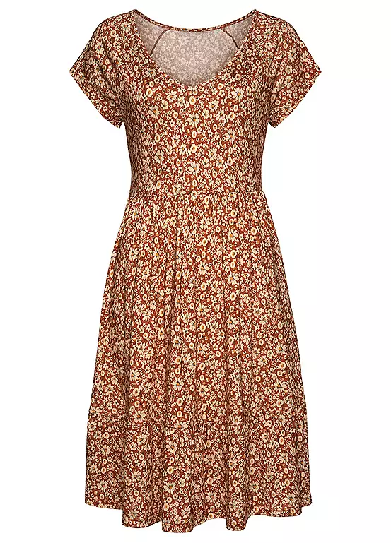 This dress is just the right addition to your wardrobe for all ladies who like a vintage look. Printed with flowers, it is gentle on the skin thanks to the soft jersey fabric. A romantic v-neckline, short sleeves, a stretch band edged under the chest and a wide skirt with flounces make it the perfect companion on hot summer days.