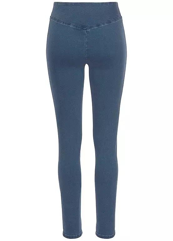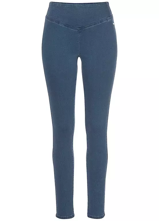 Classic jeggings by Buffalo. They feature a wide, elasticated waistband with v-shaped seam, as well as a small metal emblem on the side. Made from a soft material mix with stretch content for the perfect fit.