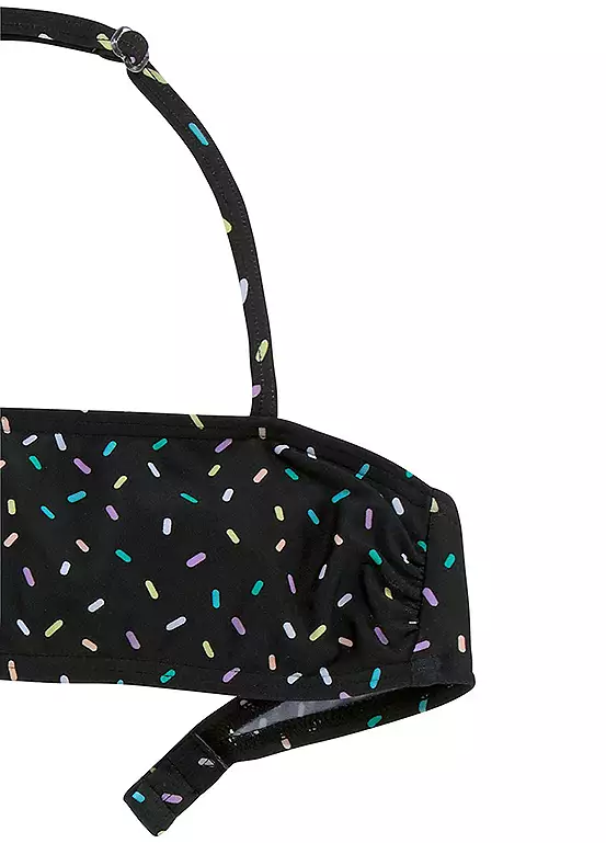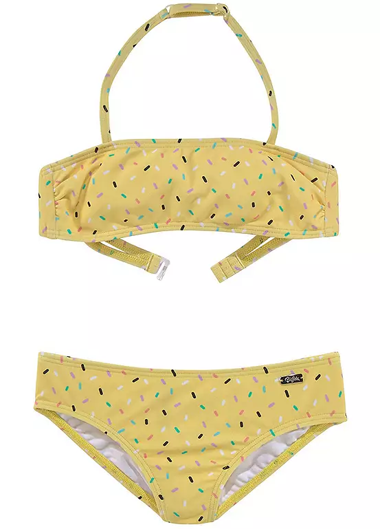Fashionable kids bandeau bikini in a summery print. The two-piece set consists of a classically cut bikini bottom and a bandeau top with an adjustable halterneck strap and side boning for support. Summery print. Adjustable halter strap.