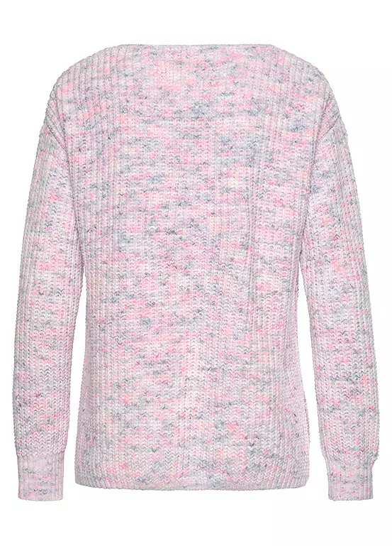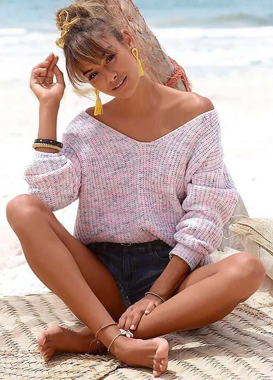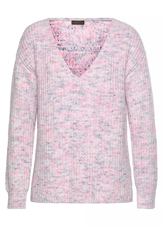A colourful pastel shade sweater in a mottled look that is ideal for those cooler summer days. This rib knit jumper is in a loose fit, has a wide v-neckline, long sleeves and short side slits. Length approx. 64 cm (25 in)
