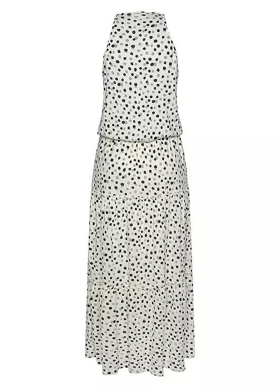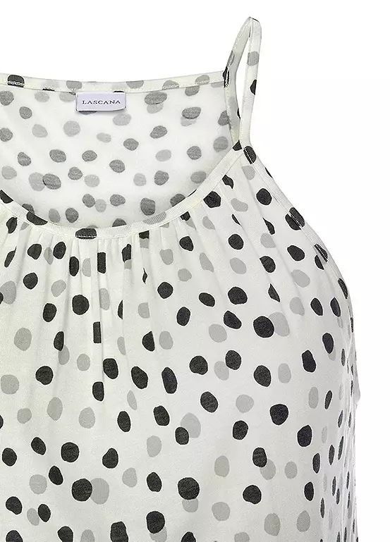 A stylish summer dress with narrow spaghetti straps. The back has a playful slit on the neck and button closure, finished with a stretch band at the waist and a pretty polka dot print.