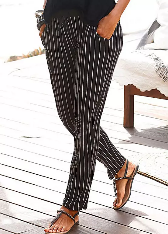 Be on-trend this summer with these striking black and white stripe beach trousers. Crafted from a light flowing fabric, featuring an elasticated waistband with decorative drawstring, complete with slit pockets at the side.