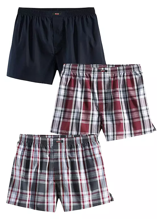 Stylish and comfortable boxer shorts in a three pack. Perfect for everyday wear. Pack contains 2 x Check design, and 1 x Plain colour.