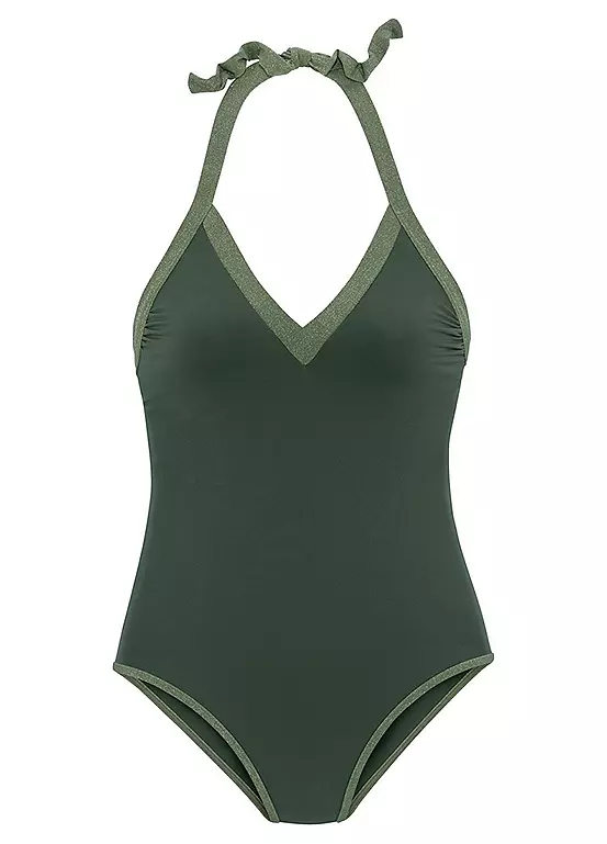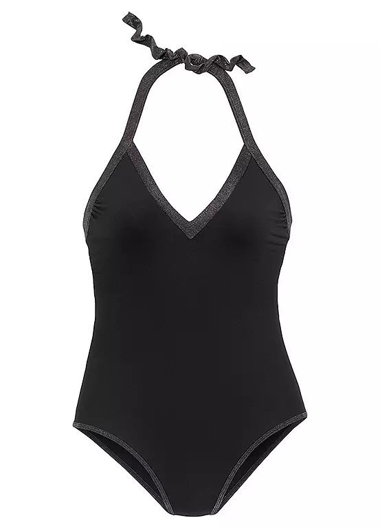 A timeless bathing suit featuring a v-neckline with the wide edging, which is harmoniously complemented by the halterneck closure. The leg cut is kept classic, while the bottom is adequately covered. Ideal for relaxing on the beach or pool. swimsuit. Sparkling inserts. Removable cups. To tie at the neck.