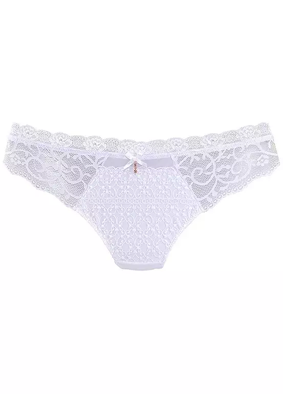 There’s seductive transparent lace at the sides and a glittery accessory at the centre front for a an elegant appearance, plus a flirty small cut-out at the back. Slip on and enjoy this tasteful lingerie, which also has a cotton gusset for more comfort. Embroidered lace. Slightly transparent. Hand wash. 75% Polyamide, 15% Elastane, 10% Polyester.