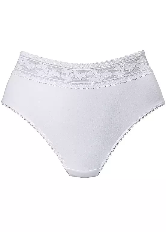 Feminine high-waist thong made from comfortable cotton featuring a fine lace waistband with a playful butterfly pattern. With integrated cotton gusset. Created with love and passion in Hamburg. Feminine high-waist thong. Made from comfortable cotton. Machine washable. 63% Cotton, 25% Polyamide, 12% Elastane.
