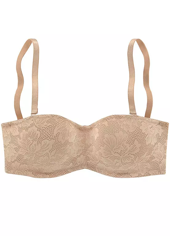 This bra is a real eye-catcher and has seamless preformed cups that are covered with floral jacquard lace for a romantic look. This bra can be worn one of three ways; normal, criss-crossed at the back or strapless, plus the straps have a silicone strip at the edge for a secure hold. The straps and the back closure can also be adjusted.