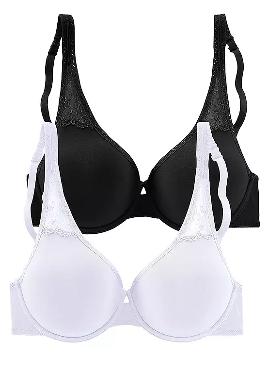 Comfortable underwired bra made from soft cotton. Its simple seamless pre-formed cups lie comfortably flat without protruding, even under tight t-shirts. The bottom of the straps features plain coloured embroidery that creates a feminine look plus the cups are lined at the side to provide comfortable support even in large sizes. Available in an economical double pack containing basic black and white colours. The straps and rear fastening are adjustable.