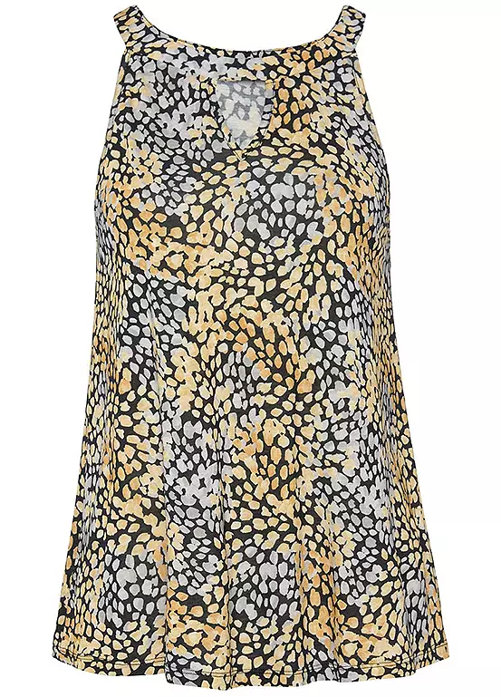 A soft flowing viscose top by s.Oliver with an all-over print featuring an American neckline with a cut-out element. It comes in a slightly flared fit with a straight hem. Small cut-out at the neckline. Slightly flared fit. Machine washable. 100% Viscose.