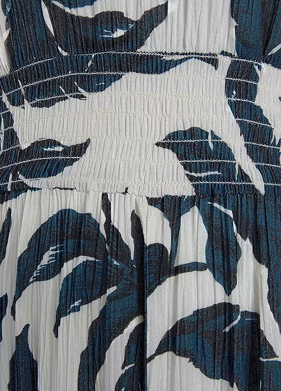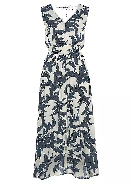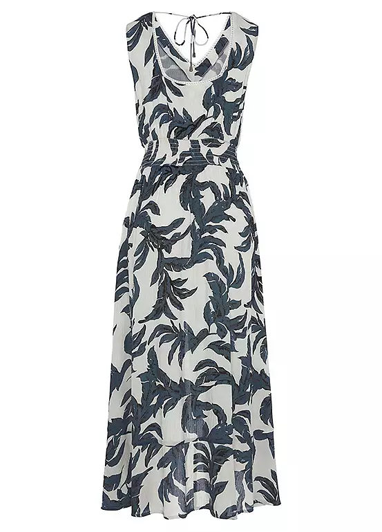 A sleeveless maxi dress featuring a v-neckline with a subtle lace trim and a tie at the back of the neck. Comfortable smocking at the waist and an all over print. Each piece is unique.