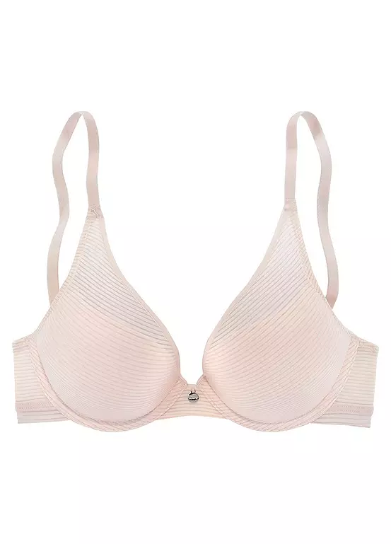 A cool basic and extremely comfortable, this fashionable push-up bra features seamlessly preformed cups with removable pads which is ideal for wearing under fitted clothing. For added convenience, a hook-and-eye closure at the back allows underbust adjustment. In addition to the unique comfort, the fashionable underbust band is a real eye-catcher – the transparent soft mesh combined with opaque material forms a cool striped look and this extends over the cups in a subtle effect. The fashionable design is rounded off by the fine metal accessory in the front centre and adds a cool touch. 60% polyamide, 35% polyester, 5% elastane.