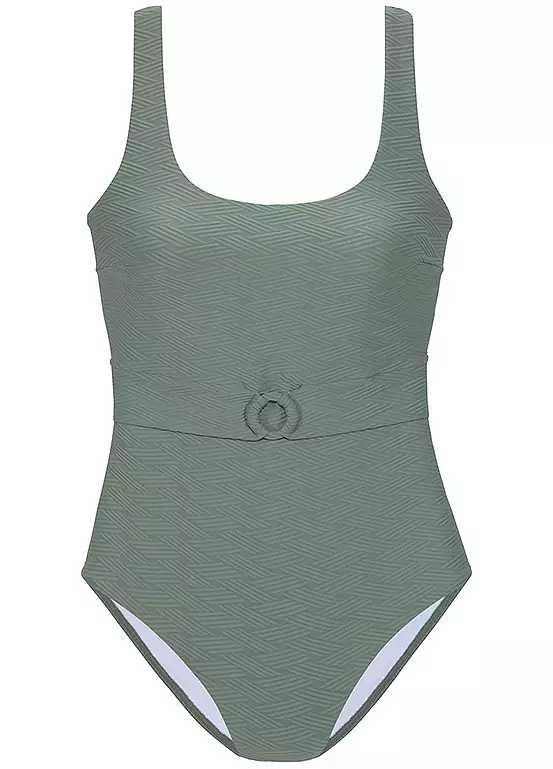 A stylish swimsuit from Sunseeker with a modern structure and a decorative belt. Great for the beach, it features removable soft cups and good support thanks to the elasticated underbust. Structured soft material. In trendy colours. Elasticated underbust. Hand wash. Outer: 82% Polyamide, 18% Elastane. Lining: 92% Polyester, 8% Elastane.