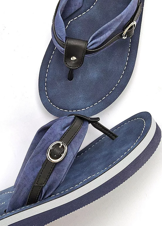 Summery flip-flops with buckle strap detail in faux leather and textile. Finished with a light synthetic sole, and soft flexible fabric. Upper: Faux leather and textile. Sole: Synthetic. Vegan – free of animal components.