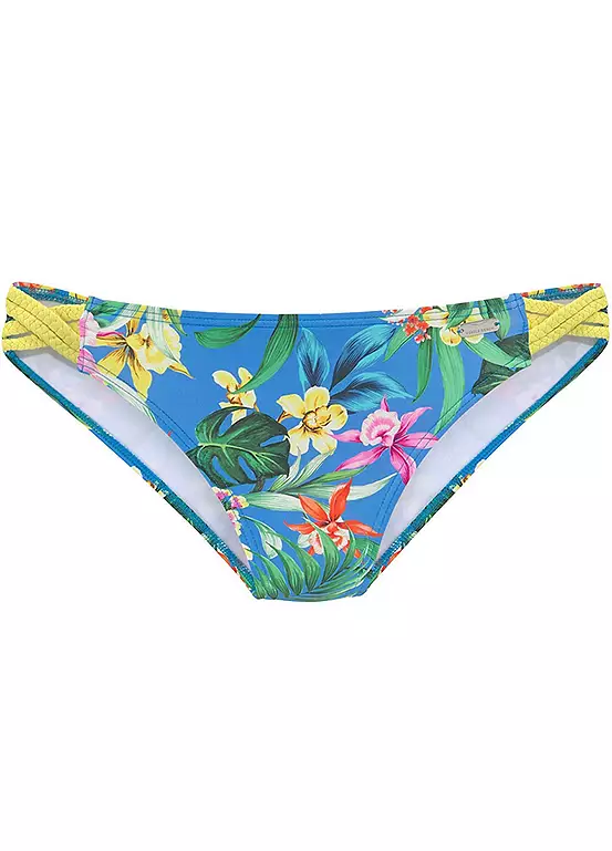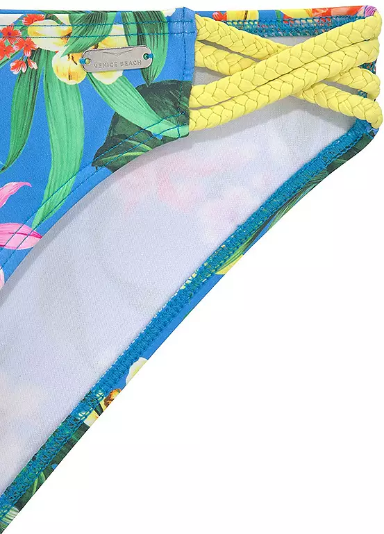 Printed bikini bottoms with crossed straps on the side. Printed – each piece is unique. Lateral with braided straps.