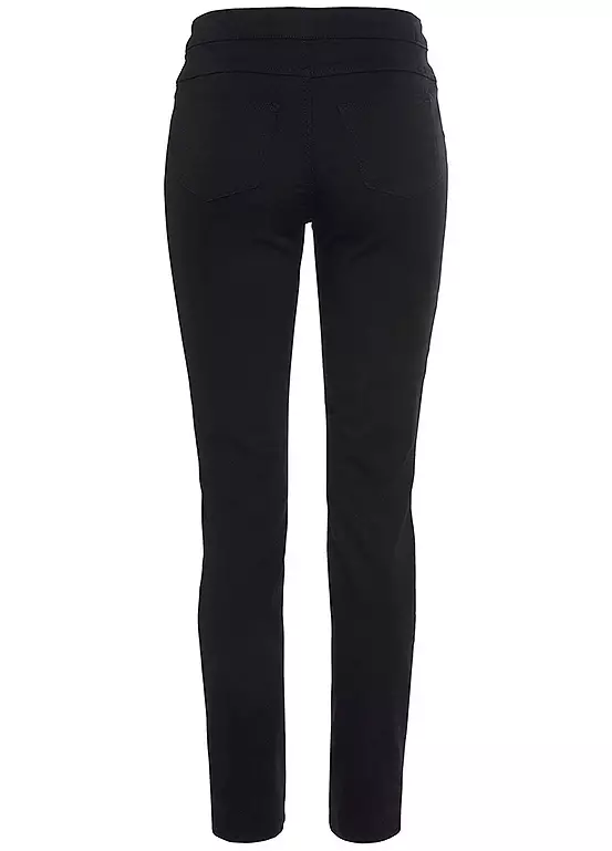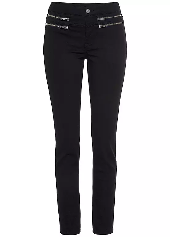 Comfortable jeggings with decorative zips at the front. Patch back pockets. Extra narrow fit with straight leg ends. Very elastic denim quality.
