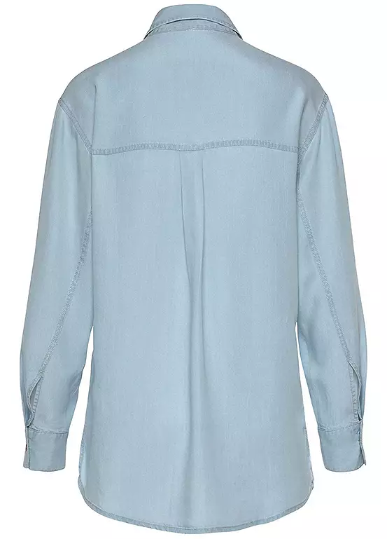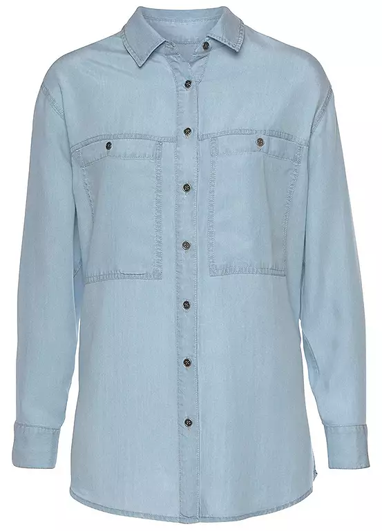 A casual long sleeve blouse with cuffs, a side slit hem and patch chest pockets. In a casual oversized look with a soft denim effect. Casual oversized style. Long sleeves with cuffs. Hem with side slits.