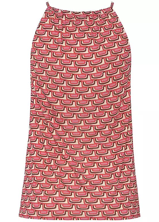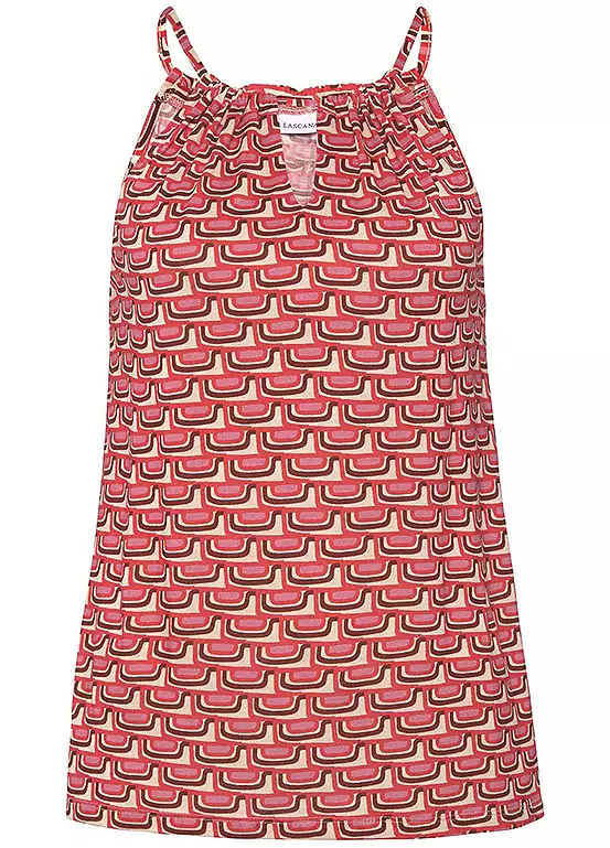 Summery cami top with an all-over pattern print in a retro design. Finished with a round neckline with gathering, cut-out detail and spaghetti straps. Neckline with a small slit. Fashionable shape.