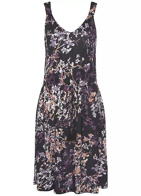 Charming midi dress by Vivance. Floral all-over print. Each part is unique. Deep V-neckline. Cut-out at the back. Wide straps with knot details. Elasticated waist with drawstring and tassels. Slightly flared skirt part. Soft jersey quality. V-neckline. Wide straps. knee free length. 100% Viscose.