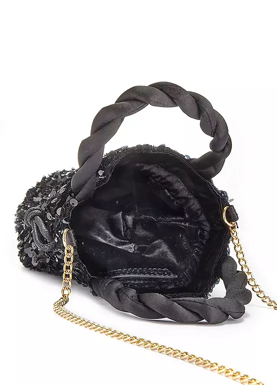 Sequinned bag with cored handles and chain straps. Perfect for those glam nights out on the town. Dimensions approx. 19H x 12W cm.