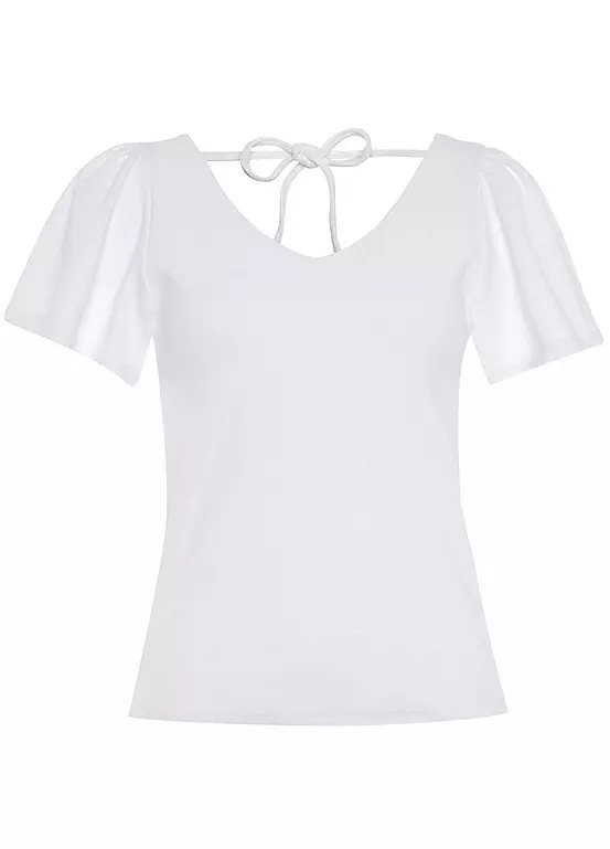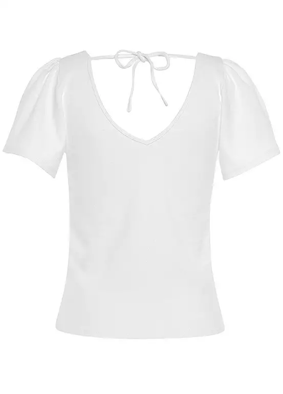 The deep v-neckline of this top skilfully stages your décolleté. In addition, the wide cap sleeves with ruffles underline the feminine look. Ties at the back of the neck also makes the top look good from the back. Due to the narrow fit, it can be ideally styled with all looks. V-neckline. Short sleeves. Machine washable. 95% Cotton, 5% Elastane.
